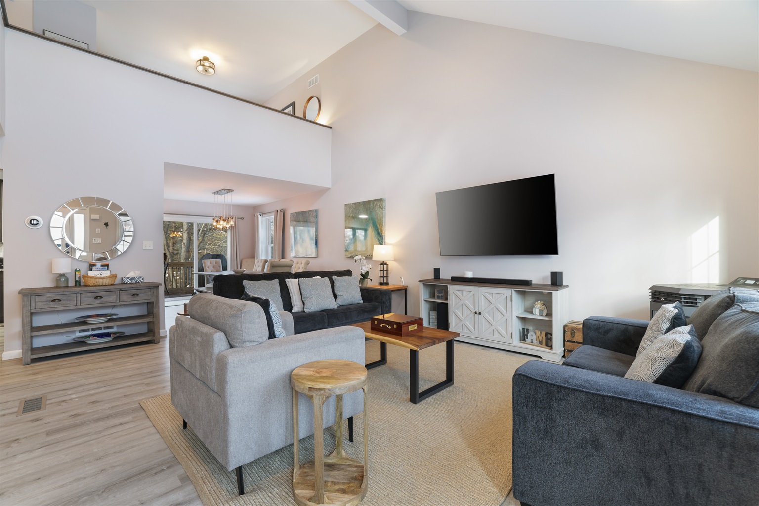 Inside, you’ll find an inviting open layout with ample space for the whole family. The home features a fully stocked kitchen, comfortable dining and living areas, and a dedicated game/movie room with a foosball table, air hockey, and a cozy theater setup for movie nights.